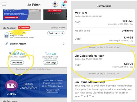 - यहां आपको अपने प्लान की डिटेल्स दिखाई देंगी। साथ ही Jio Celebrations Pack भी दिखाई देगा।