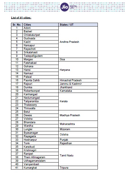 Jio ने भारत के 41 अन्य शहरों में अपने जियो ट्रू 5G सर्विस का विस्तार किया है। इसके बाद अब भारत के कुल 406 शहरों में ऑपरेटर्स की सर्विस उपलब्ध है। नए जुड़े शहरों की लिस्ट में आंध्र प्रदेश के अदोनी बडवेल चिलकालुरिपेट गुडिवाड़ा और रायचोटी जैसे सहर शामिल है।