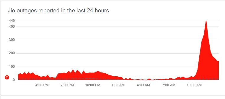 Downdetector ने जानकारी दी है कि 28 दिसंबर को Jio मोबाइल और ब्रॉडबैंड सेवाओं को आज सुबह से ही आउटेज का सामना करना पड़ रहा है और लगभग 440 से अधिक रिपोर्टें मिली हैं, जो यूजर्स द्वारा Jio मोबाइल और ब्रॉडबैंड सेवाओं को एक्सेस करने में असमर्थ होने की समस्या को दिखा रहे हैं। ये समस्या सुबह 10 बजे को बाद शुरू हुई और लगभग 11: 25 बजे तक यह समस्या चरम पर रही।