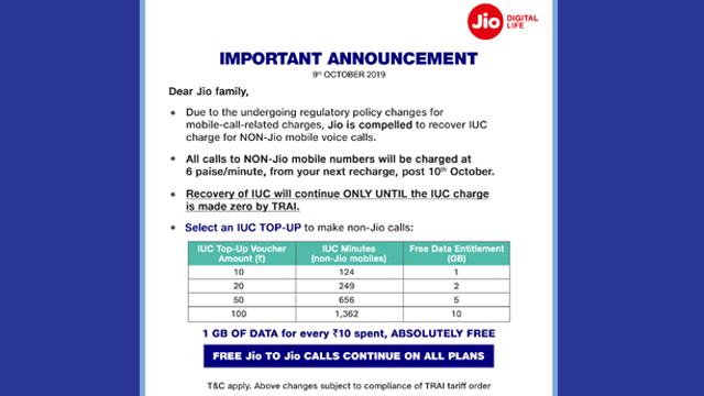 Jio की विज्ञप्ति के मुताबिक, अन्य नेटवर्क पर कॉल करने के लिए यूजर्स को 6 पैसे प्रति मिनट के हिसाब से चार्ज देना होगा। हालांकि, कंपनी ने इस घोषणा के साथ-साथ कई टॉप-अप वाउचर्स भी लॉन्च किए, जिसके जरिए यूजर्स को अन्य नेटवर्क पर फ्री-कॉलिंग के लिए टॉक –टाइम दिया जा रहा है। यही नहीं कंपनी अपने यूजर्स को कंपन्सेट के तौर पर फ्री डाटा भी ऑफर कर रही है।