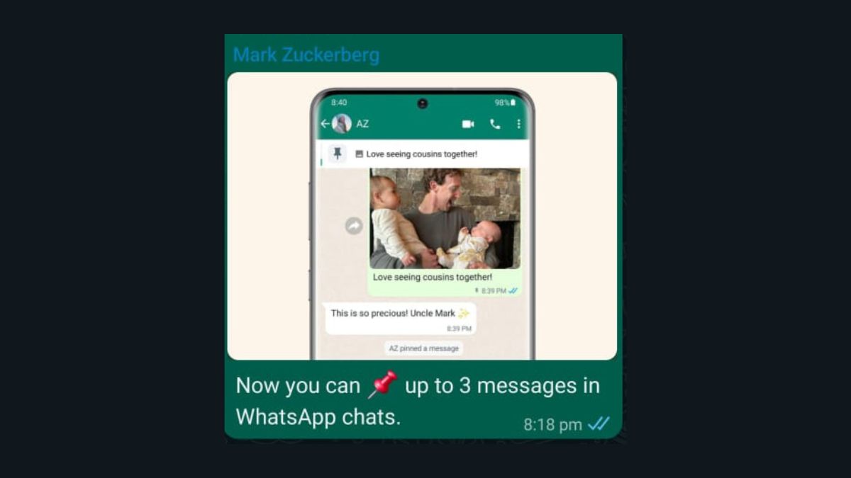 मेटा सीईओ मार्क जुकरबर्ग ने एक नया अपडेट शेयर किया है। यह अपडेट जुकरबर्ग ने अपने ऑफिशियल वॉट्सऐप चैनल के जरिए शेयर किया है। वॉट्सऐप चैट्स पर अब तीन मैसेज को पिन करने की सुविधा मिल रही है। बता दें पहले केवल एक ही मैसेज को पिन करने की सुविधा मौजूद थी। जुकरबर्ग ने एक इमेज शेयर कर नया अपडेट जारी किया है।