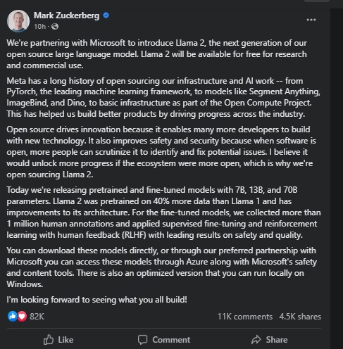 मेटा के सीईओ मार्क जुकरबर्ग ने घोषणा की कि कंपनी अपने एआई लार्ज लैंग्वेज मॉडल की अगली पीढ़ी को पेश करने के लिए माइक्रोसॉफ्ट के साथ साझेदारी कर रही है। इस तकनीकी को कर्मशियल उपयोग के लिए मुफ्त बना रही है। इसे Llama 2 के नाम से जाना जाता है।
