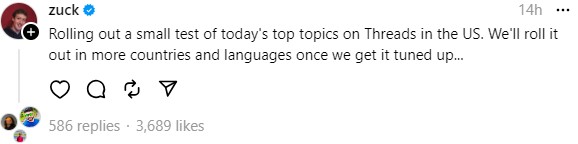 - मार्क जुकरबर्ग ने कहा कि कंपनी अमेरिका में डेली ट्रेंडिंग टॉपिक की टेस्टिंग शुरू कर रही है और यह सुविधा जल्द ही अन्य देशों और भाषाओं में शुरू की जाएगी।