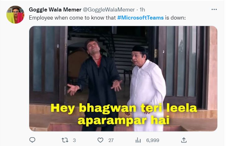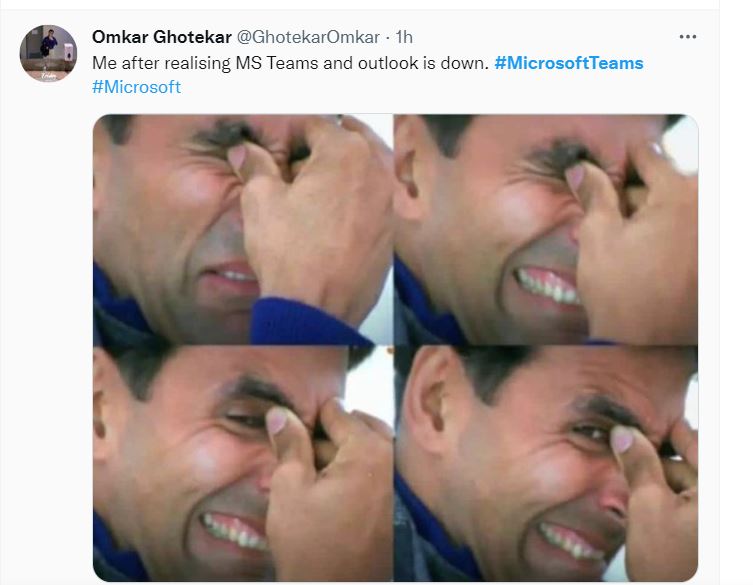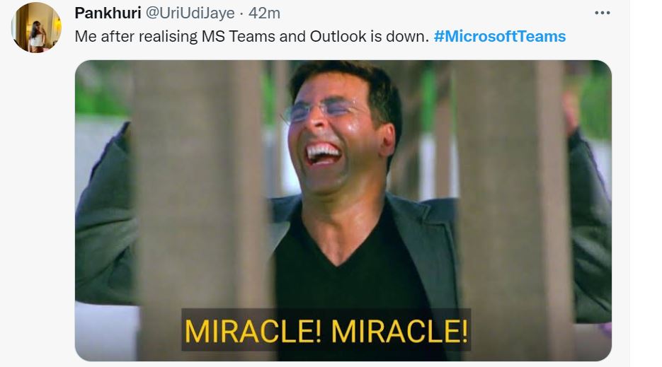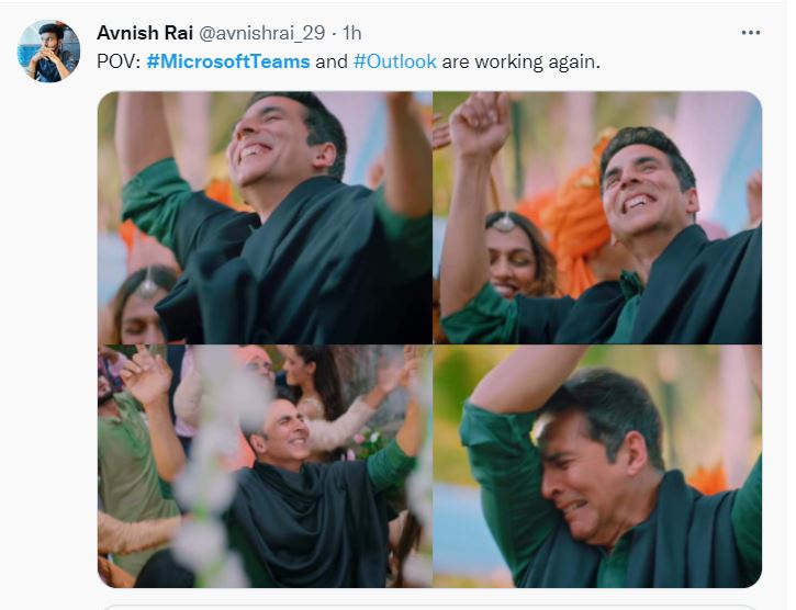 माइक्रोसॉफ्ट के कई प्लेटफॉर्म डाउन होने के बाद से ही सोशल मीडिया हैंडल ट्विटर पर यूजर्स की प्रतिक्रियाएं सामने आ रही हैं। सोशल मीडिया यूजर्स ने मीम्स के जरिए अपनी प्रतिक्रिया दर्ज करवाई हैं। सोशल मीडिया यूजर्स ने बॉलिवुड एक्टर अक्षय कुमार के अलग- अलग एक्सप्रेशन का इस्तेमाल मजेदार मीम्स शेयर किए हैं।