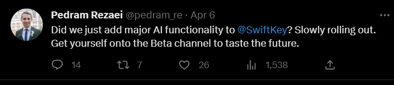 Microsoft के चीफ टेक्नोलॉजी ऑफिसर, पेडराम रेज़ाई (Pedram Rezaei) ने एक ट्वीट के माध्यम से बिंग चैट एआई को स्विफ्टकी के एकीकरण की घोषणा की है। उन्होंने शेयर किया है कि नया AI टूल यूजर के लिए "धीरे-धीरे रोल आउट" हो रहा है और Play Store से SwiftKey बीटा ऐप डाउनलोड करके इसे एक्सेस किया जा सकता है। एक बार इंस्टॉल हो जाने के बाद, स्विफ्टकी बीटा यूजर SwiftKey का इस्तेमाल कर किसी भी ऐप में एक टैप के साथ माइक्रोसॉफ्ट के बिंग चैटबॉट का इस्तेमाल करने में सक्षम होंगे।