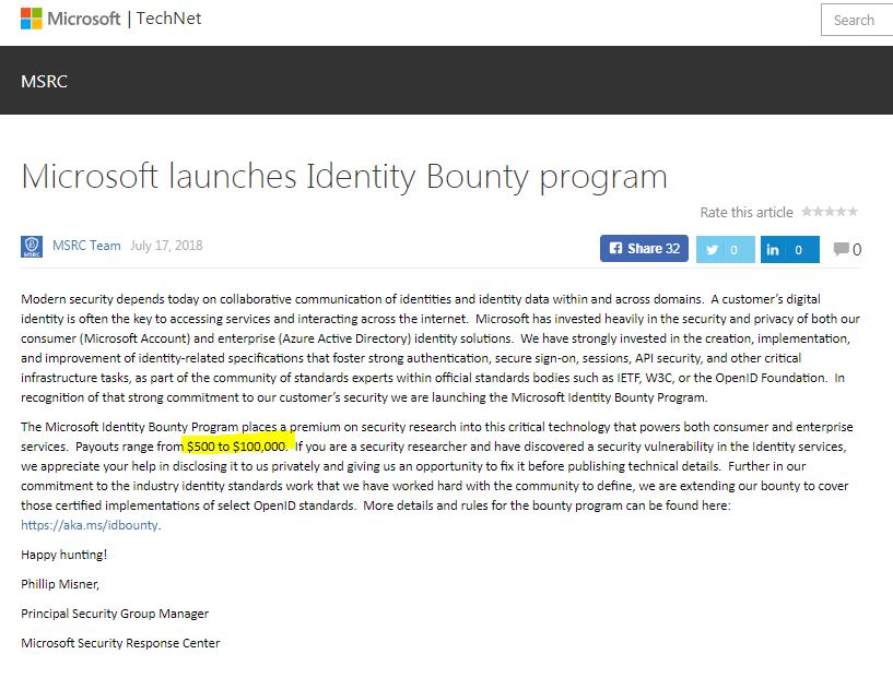 नई दिल्ली (टेक डेस्क)। Microsoft ने अपने सर्विस को दुरस्त करने के लिए आइडेंटिटी बाउंटी प्रोग्राम शुरू किया है। इस कार्यक्रम के तहत सूचना की सुरक्षा में किसी भी तरह का बग ढूंढ़ने वाले को 15 हजार अमेरिकी डॉलर से लेकर 2.5 लाख अमेरिकी डॉलर के बीच ईनाम दिया जाएगा। इस बात की जानकारी माइक्रोसॉफ्ट के मुख्य सिक्योरिटी जनरल मैनेजर फिलिप मिसेनर ने एक ब्लॉग पोस्ट के जरिए दी है।