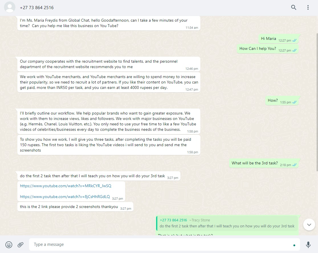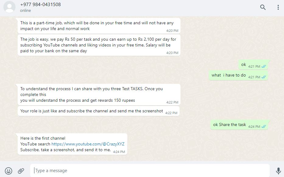 हमने खुद भी इस तरह के मैसेज प्राप्त किए है। जिसमें स्कैमर ने लिखा कि यह एक पार्ट टाइम जॉब है, जो आपके खाली समय में की जाएगी और आपके जीवन और सामान्य काम पर कोई प्रभाव नहीं पड़ेगा।