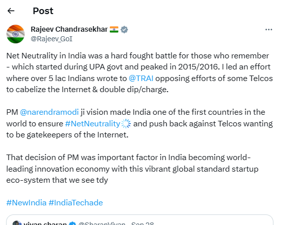 उन्होंने सोशल मीडिया प्लेटफॉर्म X पर एक पोस्ट शेयर किया है जिसमें उन्होंने नेट न्यूट्रैलिटी सुनिश्चित करने के लिए भारत की स्तिथि पर जोड़ दिया है।