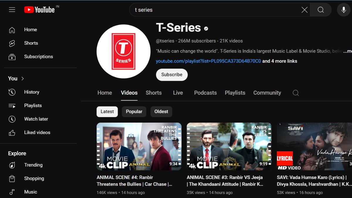 टीसीरीज के लेटेस्ट वीडियो की बात करें तो यह करीब 14 घंटे पहले अपलोड हुआ है। यह वीडियो रणबीर कपूर और अनिल कपूर की बॉलीवुड फिल्म एनिमल का एक सीन है।