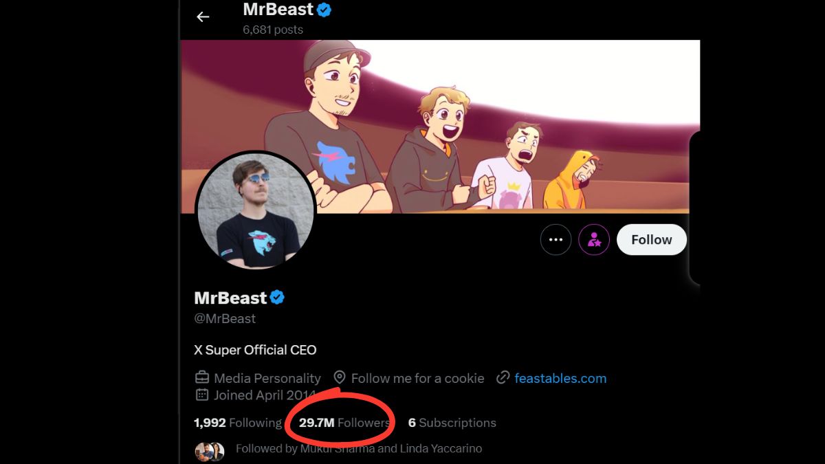 पॉपुलर माइक्रोब्लॉगिंग वेबसाइट एक्स की बात करें तो यहां भी फॉलोअर्स की संख्या में मिस्टर बीस्ट ही आगे नजर आते हैं। मिस्ट बीस्ट के एक्स हैंडल पर फॉलोअर्स की कुल संख्या 29.7 मिलियन है। वहीं, टीसीरीज की बात करें तो टीसीरीज के ऑफिशियल एक्स हैंडल पर फॉलोअर्स की कुल संख्या 2.1 मिलियन है।