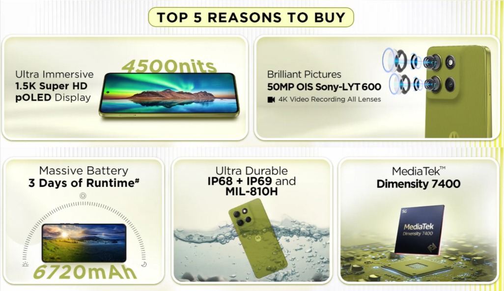 स्पेसिफिकेशन की बात करें तो मोटोरोला के इस डिवाइस में आपको 6.67 इंच का pOLED डिस्प्ले मिल रहा है जिसके साथ क्रिस्प 1.5K रेजोल्यूशन और स्मूथ 120Hz रिफ्रेश रेट मिल रहा है। दिन में तो यह डिस्प्ले काफी ज्यादा बेहतर एक्सपीरियंस दे सकती है क्योंकि इसमें आपको 4,500 निट्स तक का पीक ब्राइटनेस मिल रहा है।