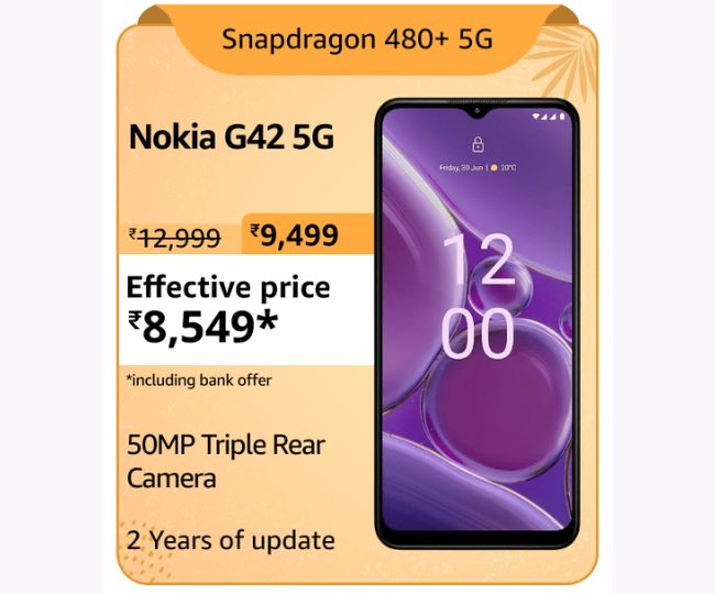 Nokia G42 5G फोन को कंपनी 12,999 रुपये की एमआरपी पर पेश करती है। फोन का सेलिंग प्राइस 9,499 रुपये है।