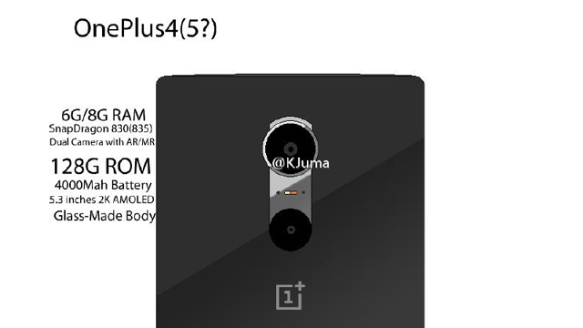Weibo पर पोस्ट की गई तस्वीर के मुताबिक, यह फोन 8जीबी या 6जीबी रैम के साथ लॉन्च होगा। वनप्लस 4 स्नैपड्रैगन 830/835 प्रोसेसर से लैस होगा। इसमें 4000 एमएएच की बैटरी दी गई होगी। इसके साथ ही 128जीबी की इंटरनल स्टोरेज भी दी गई होगी। इस फोन में 5.3 इंच 2के एमोलेड डिस्पले दिया गया होगा। इसके साथ ही इस फोन में डुअल रियर कैमरा सेटअप भी दिया गया होगा। वनप्लस 4 ग्लास बॉडी से बना होगा।