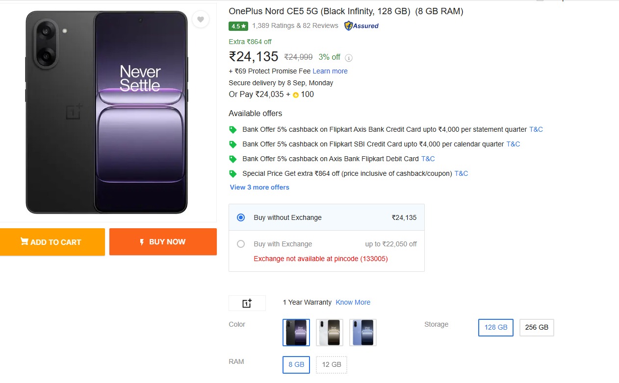 दरअसल OnePlus Nord CE 5 का वैसे तो एक्चुअल प्राइस 24,999 रुपये है लेकिन अभी आप इस फोन को बैंक ऑफर के साथ 4000 रुपये के डिस्काउंट के साथ खरीद सकते हैं। अभी ई-कॉमर्स प्लेटफॉर्म पर यह डिवाइस 24,135 रुपये में लिस्टेड है। Flipkart Axis Bank Credit कार्ड के साथ कंपनी 4000 रुपये का डिस्काउंट दे रही है जिसके बाद फोन की कीमत 20,135 रुपये रह जाती है। Flipkart SBI Credit Card पर भी आपको यह बैंक ऑफर मिल जाएगा।
