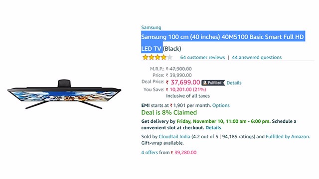 - इसमें Samsung 100 cm (40 inches) 40M5100 बेसिक स्मार्ट फुल एचडी एलईडी टीवी पर 10,201 रुपये का ऑफर मिल रहा है। इस टीवी की वास्तविक कीमत 47,900 रुपये है ।डील के अंतर्गत यह टीवी 37,699 रुपये में मिल रहा है। इसको 1901 रुपये की मासिक किश्त पर भी खरीदा जा सकता है।