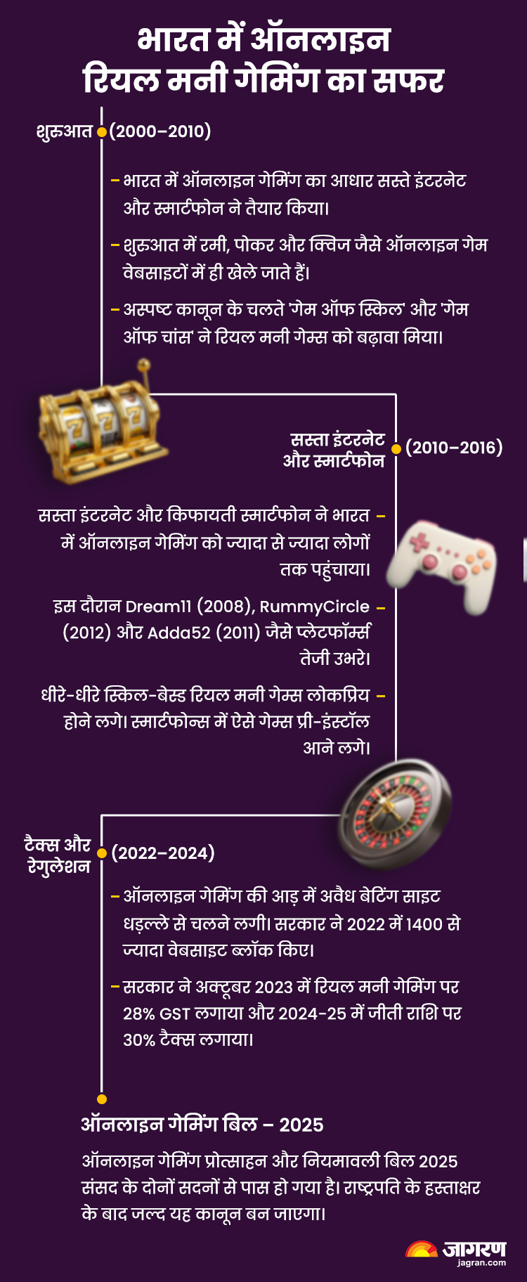 रियल मनी गेमिंग पर रोक लगाने के लिए सरकार ने ऑनलाइन गेमिंग बिल (प्रोत्साहन और नियमावली) को हाल में सदन में पेश किया। यह बिल लोकसभा और राज्यसभा दोनों से पास हो चुका है। राष्ट्रपति के हस्ताक्षर के बाद यह कानून बन जाएगा। यहां हम आपको भारत में ऑनलाइन रियल मनी गेमिंग के शुरुआत और इस बिल के बाद इस तरह के प्लेटफॉर्म पर रोक तक की पूरी कहानी बता रहे हैं।