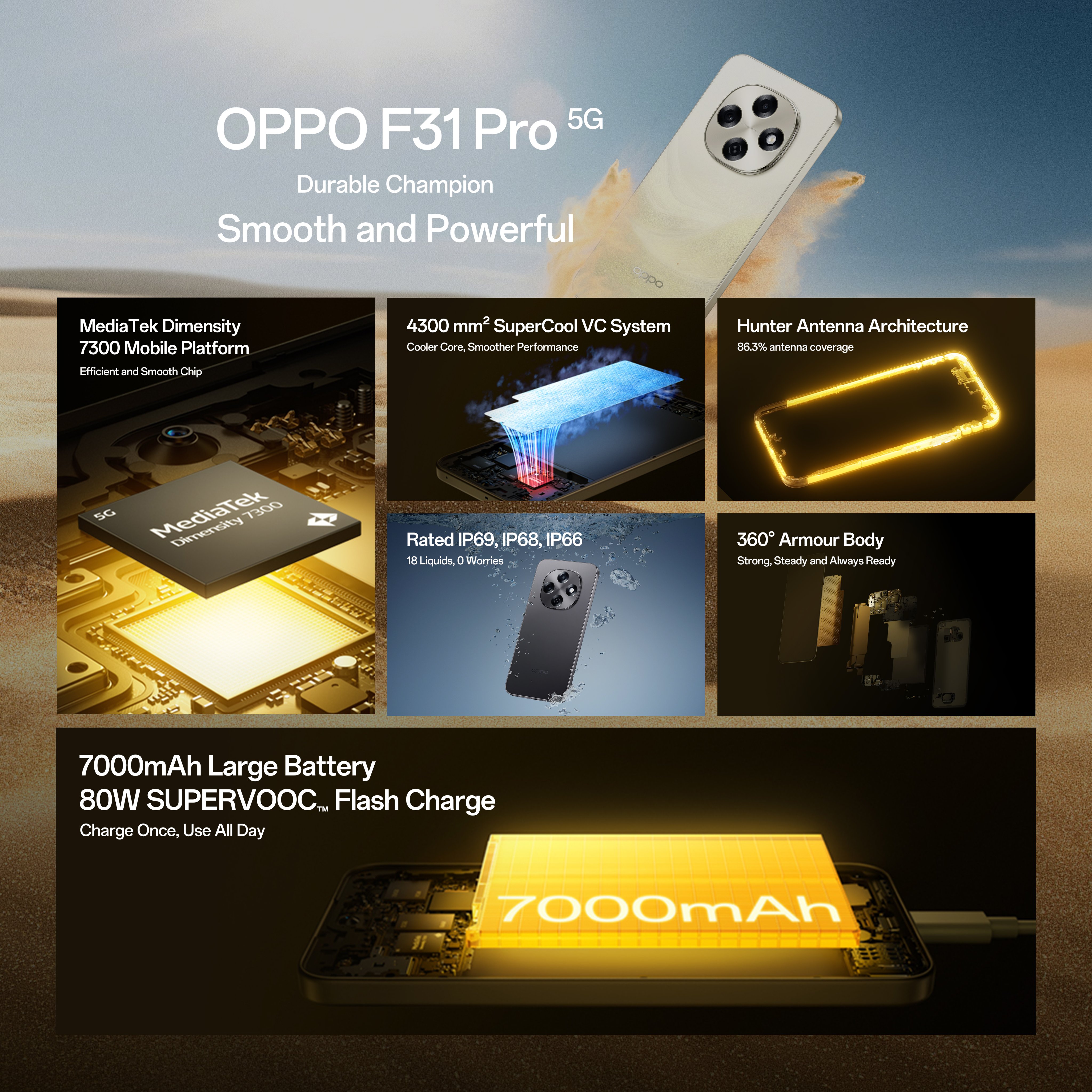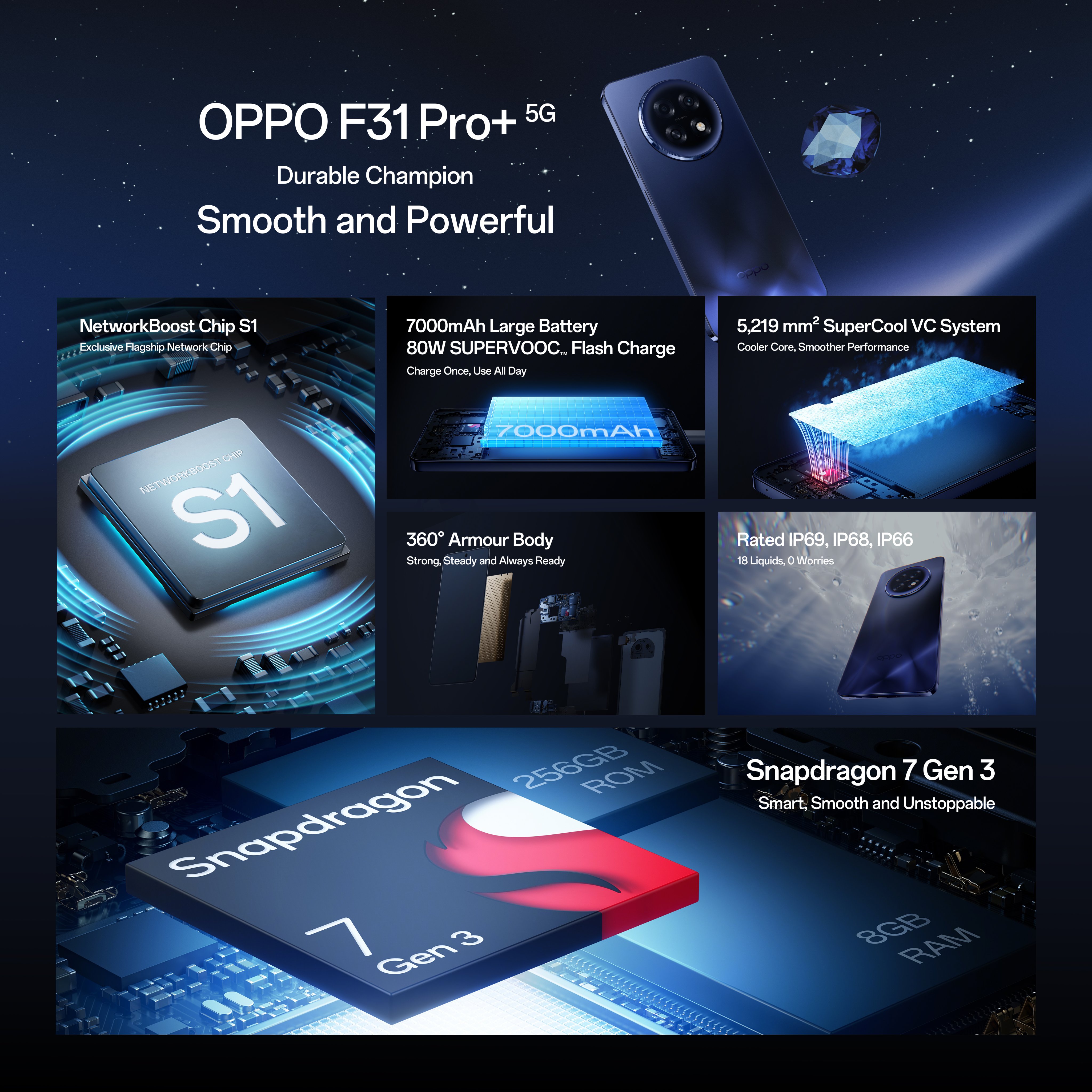 सीरीज के सबसे बेस मॉडल F31 और F31 प्रो में मीडियाटेक 6300/7300 एनर्जी चिपसेट दिया गया है, जबकि फ्लैगशिप F31 प्रो+ में स्नैपड्रैगन 7 जेनरेशन 3 चिपसेट मिलता है। डिवाइस में 80W फास्ट चार्जिंग सपोर्ट के साथ 7,000mAh की बैटरी भी मिल रही है। साथ ही डिवाइस में IP66/IP68/IP69 वाटर रेजिस्टेंस, MIL-STD-810H-सर्टिफाइड 360° आर्मर बॉडी मिल जाती है। चलिए सभी डिवाइस की पहले कीमत जान लेते हैं...