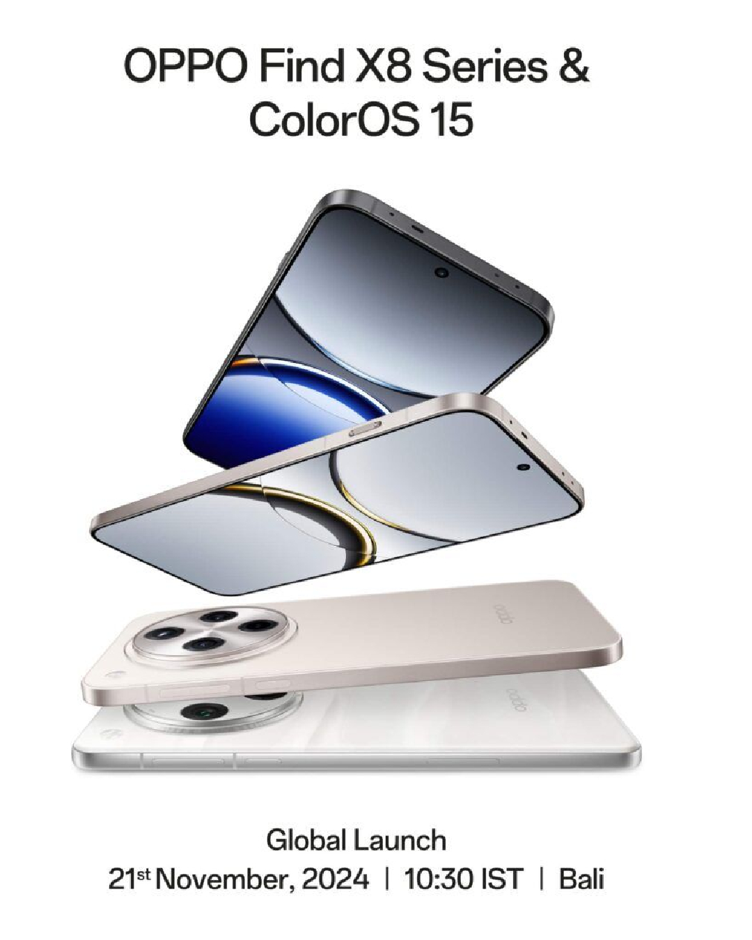 OPPO Find X8 सीरीज और ColorOS 15 ग्लोबली 21 नवंबर को सुबह 10:30 बजे लॉन्च होंगे। इसके लिए कंपनी इंडोनेशिया के बाली में एक इवेंट आयोजित करने वाली है। भारत में इस सीरीज को मीडियाटेक डाइमेंसिटी 9400 चिपसेट के साथ लाए जाने की उम्मीद है।