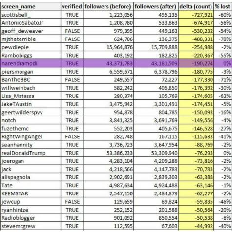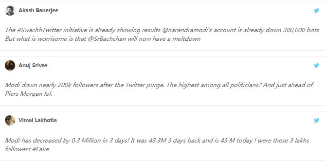 12 जुलाई को पीएम मोदी के ट्विटर अकाउंट पर 43.4 मिलियन (करीब 4.34 करोड़) फॉलोअर्स देखे गए थे। जबकि, 13 जुलाई को पीएम मोदी के अकाउंट पर 43.1 मिलियन (करीब 4.31 करोड़) फॉलोअर्स रह गए। इसके अलवा पीएम के एक और ट्विटर हैंडल @PMOIndia से भी 1 लाख फॉलोअर्स कम हो गए हैं। इसके बाद कई ट्विटर यूजर्स ने ट्वीट्स के जरिए ट्रोल भी किया।