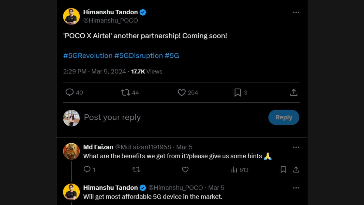 बता दें, इससे पहले हिमांशु टंडन ने एक्स हैंडल पर एक यूजर का रिप्लाई करते हुए कहा था कि पोको की नई पेशकश अब तक का सबसे सस्ता 5G Smartphone होगा।