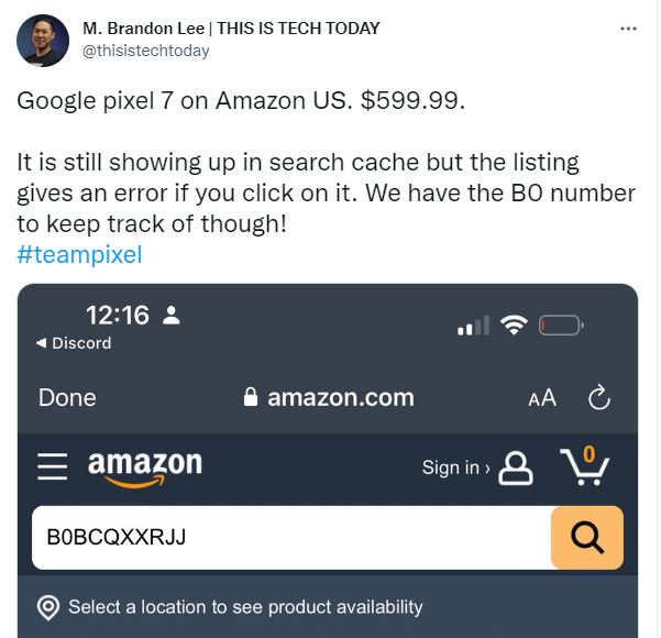 ट्विटर पर ब्रैंडन ली नाम के एक व्यक्ति ने अमेजन यूएस में Google Pixel 7 को लिस्ट किया, इसकी कीमत का खुलासा किया और रिलीज़ की तारीख का संकेत दिया।