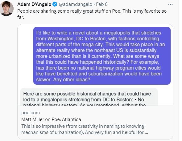 Quora ने भी हाल ही में एक ऐप भी लॉन्च किया है जो यूजर्स को ChatGPT सहित कई AI चैटबॉट्स के साथ कम्युनिकेट करने की अनुमति देता है। वहीं कंपनी ने CEO एडम डी'एंजेलो ने दिसंबर 2022 में Poe नाम के Quora के चैटबॉट की घोषणा की। बता दें कि उस समय इसे बीटा वर्जन के साथ पेश किया गया था। बता दें कि Poe यूजर्स को एआई से सवाल पूछने,तुरंत उत्तरों को जानते और बातचीत करने की अनुमति देगा।