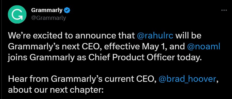 लिंक्डिन पर, राहुल रॉय चौधरी (CEO of Grammarly) ने कहा, “मैं दो साल पहले ग्रामरली में शामिल हुआ, क्योंकि संचार में सुधार करके जीवन को बेहतर बनाने के हमारे मिशन में गहरा विश्वास था। मैं 1 मई से शुरू होने वाले ग्रामरली के सीईओ के रूप में एक नई क्षमता में उस मिशन की सेवा करने के लिए सम्मानित महसूस कर रहा हूं।
