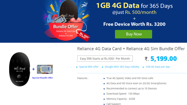 इस ऑफर को RCom-Eshop.com पर लिस्ट किया गया है। ऑफर के तहत यूजर्स को प्रीपेड 4जी सिम कार्ड के साथ हर रोज 1 जीबी 4जी डाटा दिया जाएगा। इसकी वैधता 356 दिन यानि 1 साल की है। इसका सीधा मतलब कि इस प्लान के तहत यूजर्स को 365 जीबी डाटा दिया जाएगा। यह एक बंडल ऑफर है जिसके तहत यूजर्स को नया 4जी सिम कार्ड, एक साल का डाटा प्लान और डोंगल दिया जा रहा है। इसकी कीमत 5,199 रुपये है। आपको बता दें कि केवल डोंगल की ही कीमत 3,200 रुपये है। कंपनी ने ग्राहकों के लिए 500 रुपये का ईएमआई प्लान भी लिस्ट किया है। अलग-अलग बैंकों के क्रेडिट कार्ड के साथ ग्राहक इस बंडल ऑफर को 3, 6, 9, 12, 18 और 24 महीनों की ईएमआई पर भी ले सकते हैं।