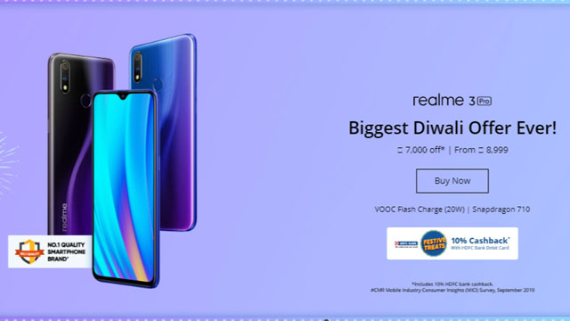 इस सेल में सबसे ज्यादा डिस्काउंट कंपनी के सबसे ज्यादा बिकने वाले स्मार्टफोन Realme 3 Pro पर दिया जा रहा है। इस स्मार्टफोन पर Rs 7,000 तक का डिस्काउंट दिया जा रहा है। इसे आप Rs 8,999 की शुरुआती कीमत में खरीद सकते हैं। इस स्मार्टफोन पर नो-कॉस्ट ईएमआई ऑफर के अलावा एक्सचेंज ऑफर भी दिए जा रहे हैं। इस स्मार्टफोन के फीचर्स की बात करें तो इसमें 6.3 इंच की फुल एचडी प्लस डिस्प्ले 90.8 आसपेक्ट रेश्यो के साथ दी गई है। फोन में 25 मेगापिक्सल का सेल्फी कैमरा दिया गया है। फोन के बैक में 16+5 मेगापिक्सल का ड्यूल रियर कैमरा दिया गया है। फोन में 4,045 एमएएच की बैटरी दी गई है।
