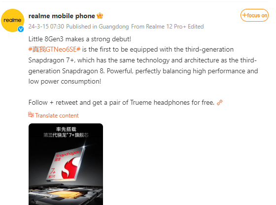 - कंपनी ने वीबो पर एक पोस्ट में बताया कि Realme GT Neo 6 SE स्नैपड्रैगन 7+ जेन 3 प्रोसेसर होगा ।