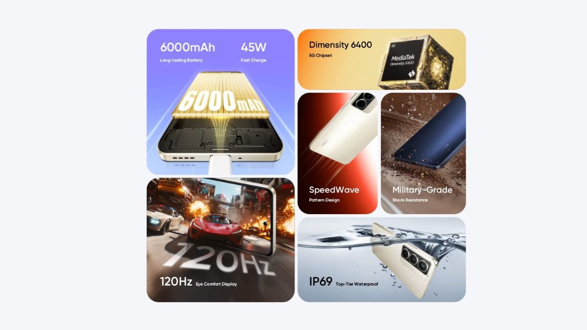 Realme NARZO 80x 5G स्मार्टफोन को 13 हजार रुपये के बजट में लॉन्च किए जाने की उम्मीद है। यह फोन MediaTek Dimensity 6400 SoC के साथ आएगा। रियलमी का यह फोन SpeedWave पैटर्न के साथ IP69 रेटिंग और मिलिट्री ग्रेड ड्यूरेबिलिटी ऑफर करेगा। इसमें 6,000mAh की Titan बैटरी दी जाएगी, जो 45W SuperVOOC फास्ट चार्जिंग सपोर्ट करेगा।