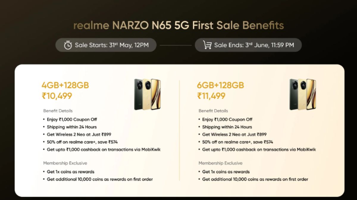 हालांकि, कंपनी इस फोन को 1000 रुपये के कूपन डिस्काउंट के साथ ऑफर कर रही है। यानी Realme Narzo N65 5G के 4GB रैम+128GB स्टोरेज वेरिएंट को आप 10,499 रुपये में खरीद सकते हैं।