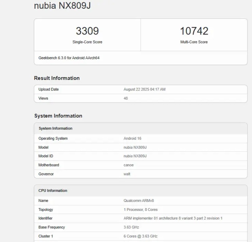 Geekbench लिस्टिंग में ये भी दिखाया गया कि Nubia NX809J फोन में 14.87GB मेमोरी है और ये 16GB RAM के साथ आ सकता है। लिस्टिंग से ये भी पता चलता है कि फोन Android 16 पर चलेगा।