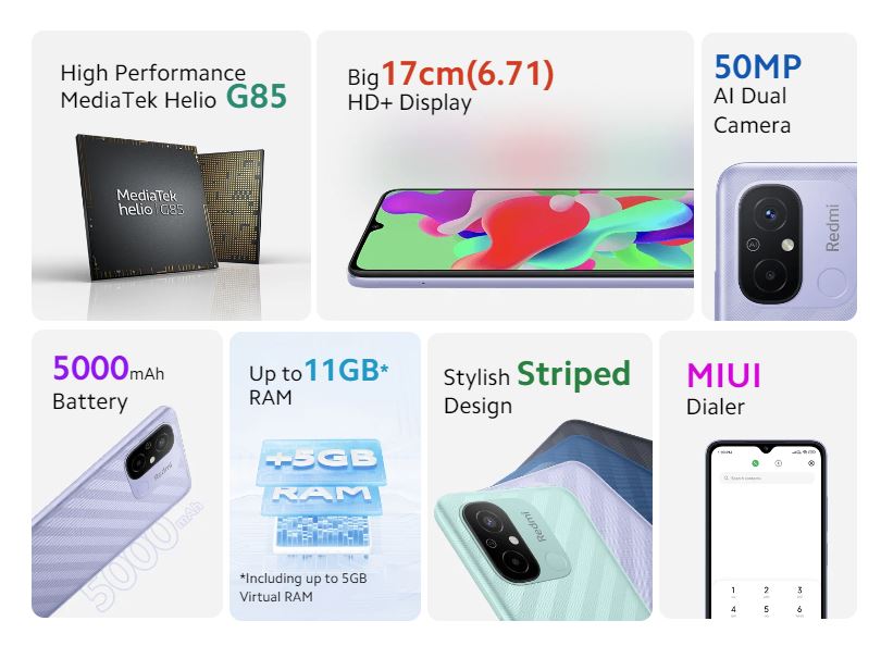 Redmi Note 12 के 6GB + 64GB स्टोरेज मॉडल की कीमत 14,999 रुपये है। ये स्मार्टफोन 6GB + 128GB स्टोरेज में भी आता है, जिसकी कीमत 16,999 रुपये है। Redmi 12C के 4GB + 64GB मॉडल की कीमत 8,999 रुपये और 6GB रैम और 128GB स्टोरेज मॉडल की कीमत 10,999 रुपये है।