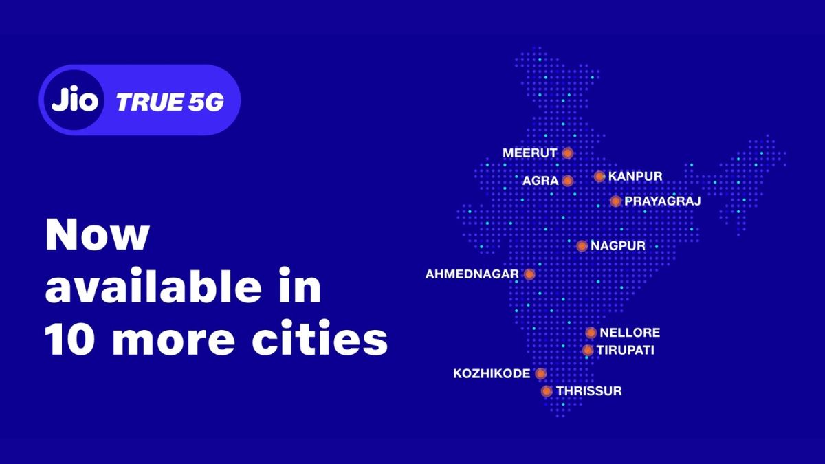 हाल ही में जियो ने दस शहरों में एकसाथ जियो ट्रू 5G को लॉन्च किया है। इन 10 शहरों में उत्तर प्रदेश के आगरा, कानपुर, मेरठ और प्रयागराज, आंध्र प्रदेश के तिरुपति और नेल्लोर, केरल के कोझीकोड और त्रिशूर साथ ही महाराष्ट्र के नागपुर और अहमदनगर शामिल हैं। बता दें कि इन शहरों में से ज्यादातर में 5G सेवाओं को लॉन्च करने वाला, रिलायंस जियो पहला और एकमात्र ऑपरेटर बन गया है।