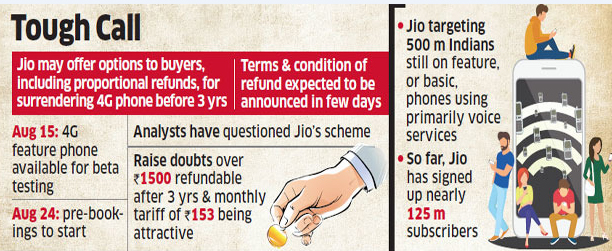ऐसी उम्मीद लगायी जा रही है की रिलायंस जियो इंफोकॉम 4G फीचर फोन लेने वाले उपभोक्ताओं को एक विकल्प प्रदान करने वाला है। इस विकल्प के अंतर्गत उपभोक्ता तीन साल से पहले हैंडसेट को वापस ले पाएंगे और सिक्योरिटी डिपॉजिट का एक भाग भी वापस ले सकेंगे। मीडिया रिपोर्ट्स के अनुसार- मुकेश अंबानी आने वाले कुछ दिनों में रिफंड स्कीम को लेकर नई घोषणा कर सकते हैं। जियो का फीचर फोन 15 अगस्त से बीटा टेस्टिंग के लिए उपलब्ध हो गया है। इस फोन की प्री-बुकिंग 24 अगस्त से शुरू होगी। डिपॉजिट राशि की स्कीम को लेकर अभी कोई आधिकारिक पुष्टि नहीं की गई है। ऐसा माना जा रहा है की कुछ विशेषज्ञों के यह प्रश्न उठाने पर की 1500 रुपये के डिपॉजिट और 153 रुपये प्रति महीना के पैक के साथ क्या ये फोन लोगों को आकर्षित कर पाएगा। इसी के बाद रिफंड विकल्प से संबंधित स्कीम के बारे में सोचा जा रहा है।