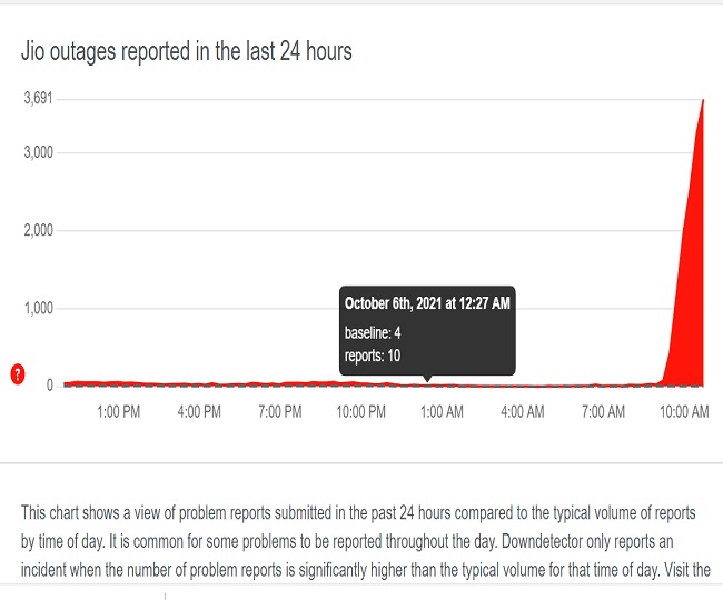 इंटरनेट पर आउटेज की रिपोर्टों की मानिटरिंग करने वाली वेबसाइट 'डाउन डिटेक्टर (Downdetector) वेबसाइट से भी Jio सर्वर के डाउन होने की सूचना मिली है। Downdetector की मानें, तो भारत में jio Mobile के नेटवर्क के इस्तेमाल में समस्या आ रही है। यूजर्स की तरफ से नेटवर्क डाउन होने की लगातार शिकायत मिल रही है। Jio सर्वर के डाउन होने की सूचना दिल्ली, लखनऊ, ग्वालियर, इंदौर, रायपुर, बैंगलोर और नाशिक जैसे शहरों से सबसे ज्यादा आ रही है। अभी तक Twitter पर करीब 4000 यूजर्स ने Jio नेटवर्क के डाउन होने की सूचना दी है।