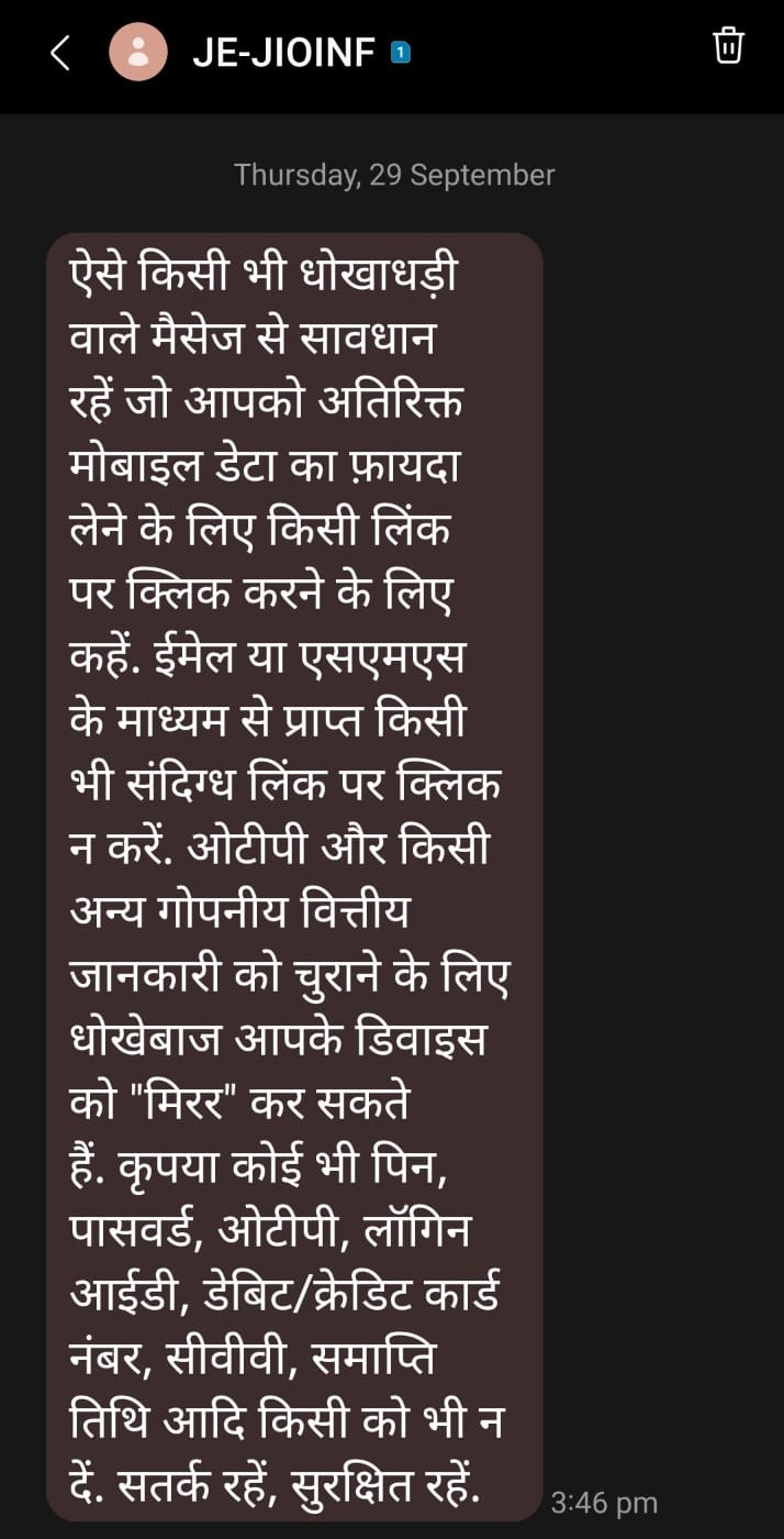रिलायंस जियो अपने यूजर्स के एक मैसेज भेज रहा है, जिसमें वह उनको ज्यादा सावधानी बरतने के लिए कह रहे हैं। इस SMS में लिखा है कि ऐसे किसी भी धोखाधड़ी वाले मैसेज से सावधान रहें जो आपको अतिरिक्त मोबाइल डेटा का फ़ायदा लेने के लिए किसी लिंक पर क्लिक करने के लिए कहें। कंपनी ने ईमेल या एसएमएस के माध्यम से प्राप्त किसी भी संदिग्ध लिंक पर क्लिक करने के लिए भी चेतावनी दी है। हम यहां आपके साथ कंपनी के भेजे गए मैसेज का स्क्रीनशॉर्ट साझा कर रहे हैं।