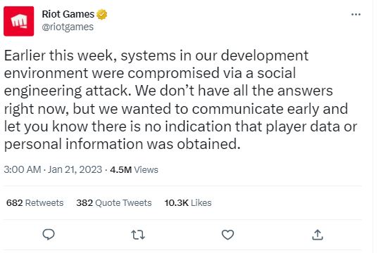 कंपनी ने यूजर्स को यह भी आश्वासन दिया कि सिक्योरिटी ब्रीच में किसी भी प्लेयर के डाटा या पर्सनल जानकारी से समझौता नहीं किया गया है। अब, Riot ने ट्वीट्स की एक नई सीरीज पोस्ट की है जिसमें दावा किया गया है कि इसके कुछ लोकप्रिय वीडियो गेम के सोर्स कोड भी साइबर हमले में चोरी हो गए हैं।