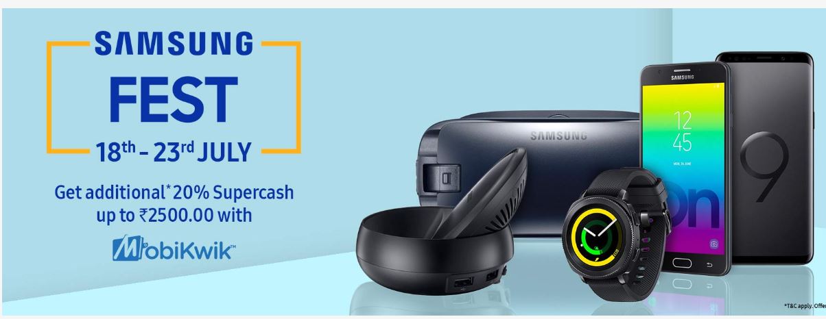 नई दिल्ली (टेक डेस्क)। स्मार्टफोन निर्माता कंपनी सैमसंग के ऑनलाइन शॉपिंग पोर्टल पर 18 जुलाई से लेकर 23 जुलाई के बीच Samsung Fest चल रहा है। इस फेस्ट में सैमसंग के स्मार्टफोन्स समेत कई डिवाइस पर डिस्काउंट ऑफर किया जा रहा है। साथ ही मोबीक्विक के जरिए पेमेंट करने पर 20 फीसद का सुपर कैशबैक दिया जा रहा है। इसके अलावा 2,500 रुपये तक का फ्लैट डिस्काउंट ऑफर किया जा रहा है।