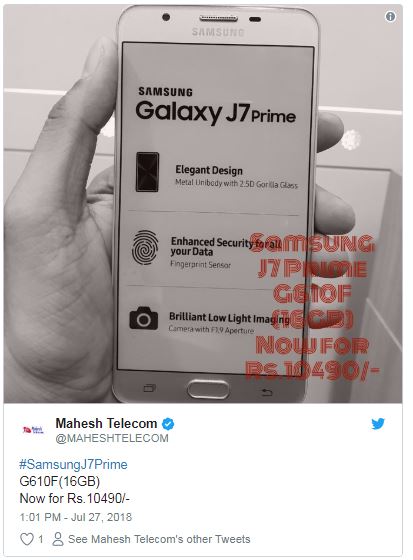 नई दिल्ली (टेक डेस्क)। कोरियाई स्मार्टफोन निर्माता कंपनी सैमसंग ने अपने गैलेक्सी सीरीज के J7 Prime (16GB) की कीमत में 8,300 रुपये की कटौती की है। यूजर्स इस स्मार्टफोन को अब केवल 10,490 रुपये में खरीद सकते हैं। कंपनी ने इस स्मार्टफोन को गोल्ड और ब्लैक कलर वेरिएंट में लॉन्च किया था। फ्लिपकार्ट पर ब्लैक वेरिएंट की कीमत 14,499 रुपये है और गोल्ड वेरिएंट की कीमत 18,642 रुपये है। इस स्मार्टफोन को जुलाई 2016 में 18,790 रुपये में उतारा गया था, अब यह स्मार्टफोन 10,490 रुपये में उपलब्ध है।