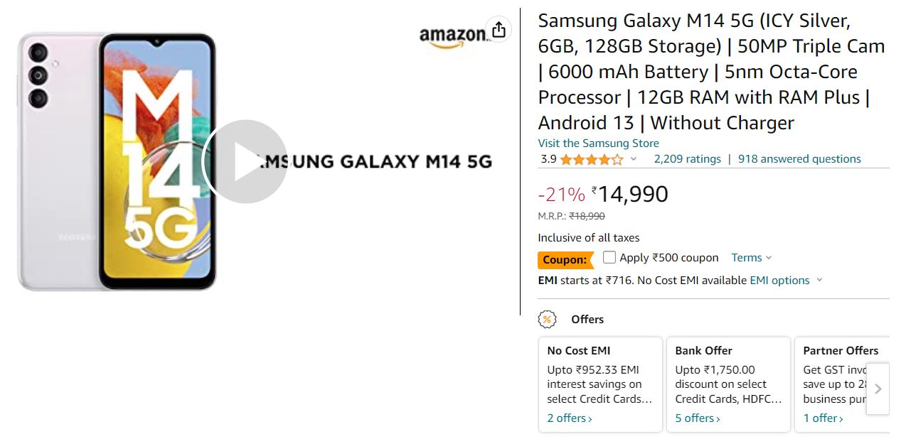 हालाकिं, अमेजन से फोन की खरीदारी करते हैं तो फोन को 21 प्रतिशत डिस्काउंट पर घर ले जा सकते हैं। Samsung Galaxy M14 5G को आप मात्र 14,990 रुपये में खरीद सकते हैं।