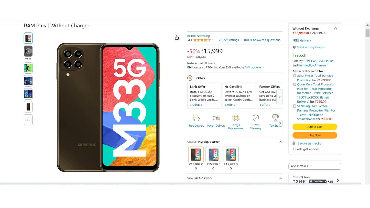 दरअसल ऑनलाइन शॉपिंग प्लेटफॉर्म अमेजन पर यूजर्स को Samsung Galaxy M33 5G कम कीमत पर ऑफर किया जा रहा है।