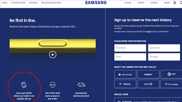 यह एक एक्सचेंज ऑफर है। इस ऑफर के तहत अगर यूजर्स इस फोन को डिस्काउंट के साथ खरीदना चाहते हैं तो उन्हें इसके लिए प्री-ऑर्डर करना होगा। ग्राहकों को अपना पुरानी फोन एक्सचेंज कर यह डिस्काउंट मिल सकात है। यह एक्सचेंज केवल गूगल, एलजी, एप्पल या सैमसंग डिवाइसेज के साथ वैध होगा। सैमसंग की ऑफिशियल वेबसाइट पर लिखा गया है कि इसके लिए पुरानी डिवाइस योग्य होनी अनिवार्य है। पुराने फोन के मॉडल के आधार पर ही डिस्काउंट दिया जाएगा। ऑफिशियल वेबसाइट के मुताबिक, फोन की डिलीवरी 24 अगस्त तक कर दी जाएगी।