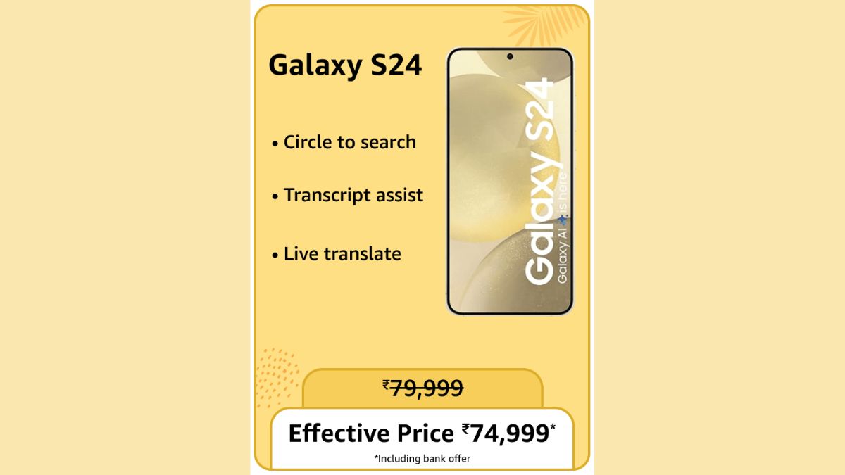Samsung Galaxy S24 5G AI (8GB+ 256GB) को अमेजन पर 79,999 रुपये में लिस्ट किया गया है। वहीं, बैंक ऑफर के साथ इस फोन की कीमत 74,999 रुपये तक कम की जा सकती है।