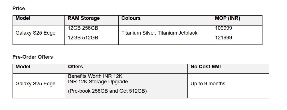 सैमसंग गैलेक्सी S25 एज का प्री-ऑर्डर ग्लोबल लेवल और भारत में भी शुरू हो गया है। इसका बेस वेरिएंट 12 जीबी रैम और 256 जीबी स्टोरेज के साथ 109999 रुपये की कीमत में लॉन्च किया गया है। दूसरा दूसरा वेरिएंट 12 जीबी के साथ 512 जीबी स्टोरेज के साथ आता है, जिसकी कीमत 121999 रुपये है।