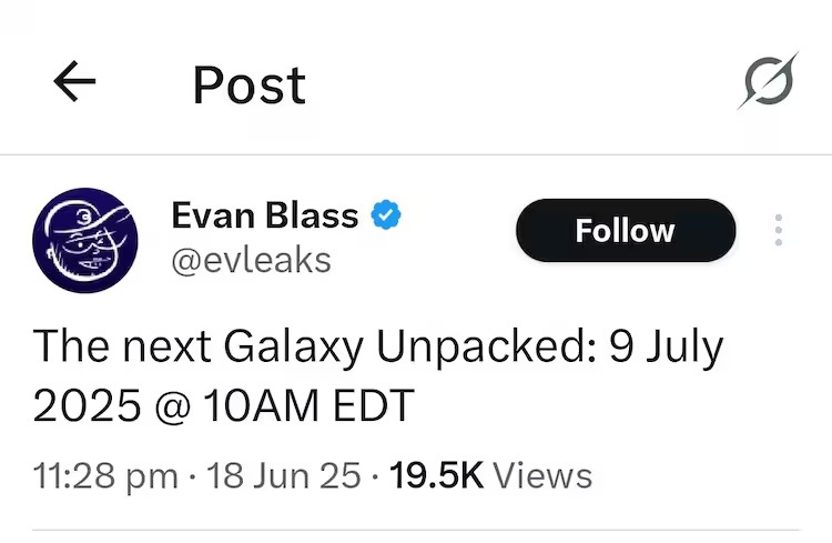सैमसंग गैलेक्सी अनपैक्ड 2025 इवेंट अगले महीने हो सकता है। टिपस्टर, इवान ब्लास के मुताबिक यह इवेंट 9 जुलाई को हो सकता है। उन्होंने यह भी बताया है कि यह इवेंट सुबह 10 बजे EDT से शुरू होगा, जिसका मतलब है कि भारत में आप शाम 7:30 बजे IST इस इवेंट को देख पाएंगे। हालांकि सैमसंग ने अभी तक इवेंट से जुड़ी कोई भी जानकारी नहीं दी है लेकिन पिछले कुछ दिनों से कंपनी अपने नए फोल्ड फोन को टीज कर रही है जिससे यह तो साफ हो जाता है कि नए फोल्ड फोन जल्द लॉन्च हो सकते हैं। अगर रिपोर्ट्स सही साबित हो जाती हैं तो आप यह इवेंट सैमसंग के YouTube चैनल पर देख पाएंगे।