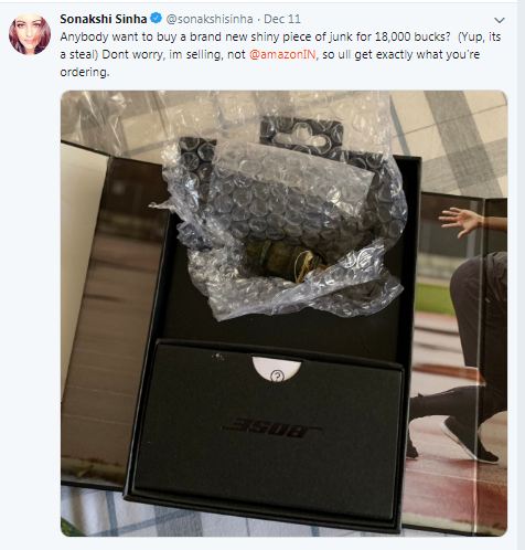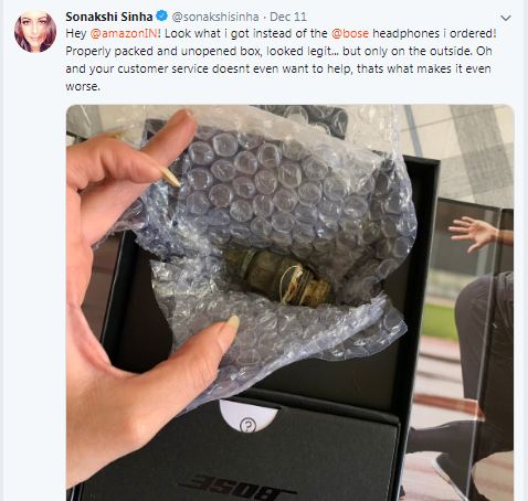 सोनाक्षी(Sonakshi) ने दो बैक-टू-बैक ट्वीट करके अमेजन से मंगाए गए ऑर्डर की फोटो शेयर करते हुए लिखा,''हे Amazon इंडिया, देखो मैंने बोस के हेडफोन ऑर्डर किए थे, और क्या निकला है! सही से पैक और बिना खुला बॉक्स, एकदम सही...लेकिन सिर्फ बाहर से ही ऐसा दिखता है। ओह, और आपकी कस्टमर सर्विस किसी भी तरह की मदद के लिए तैयार नहीं है। इससे हालात और बदतर हो गए हैं।"