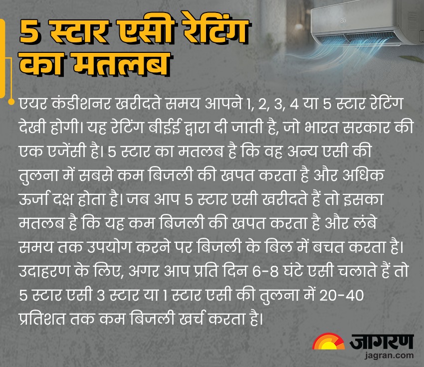 एयर कंडीशनर की एनर्जी एफिशिएंसी को बीईई स्टार रेटिंग से मापा जाता है। 5 स्टार रेटिंग वाले एसी बिजली की सबसे कम खपत करते हैं, लेकिन इनकी कीमत अधिक होती है। 3 स्टार एसी अच्छा विकल्प है, पर 5 स्टार की तुलना में थोड़ी ज्यादा बिजली खर्च करता है। 1 स्टार या 2 स्टार एसी सस्ते होते हैं, लेकिन ये अधिक बिजली खपत करते हैं। अगर रोजाना 6-8 घंटे से ज्यादा एसी चलाते हैं तो 5-स्टार एसी ही खरीदें, क्योंकि यह बिजली की बचत करेगा और आपके बिजली बिल को कम रखेगा।