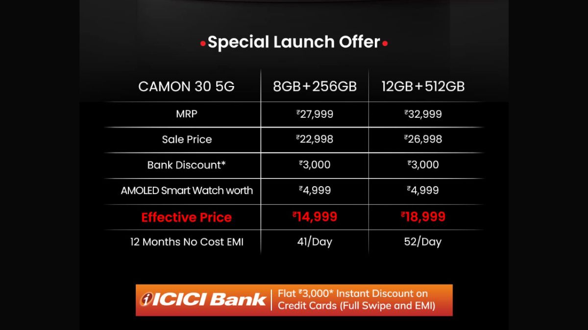 Tecno Camon 30 5G को कंपनी दो वेरिएंट 8GB+256GB और 12GB+512GB में पेश करती है। कंपनी फोन को 27,999 रुपये के शुरुआती एमआरपी पर लाती है। टॉप वेरिएंट का एमआरपी 32,999 रुपये है।
